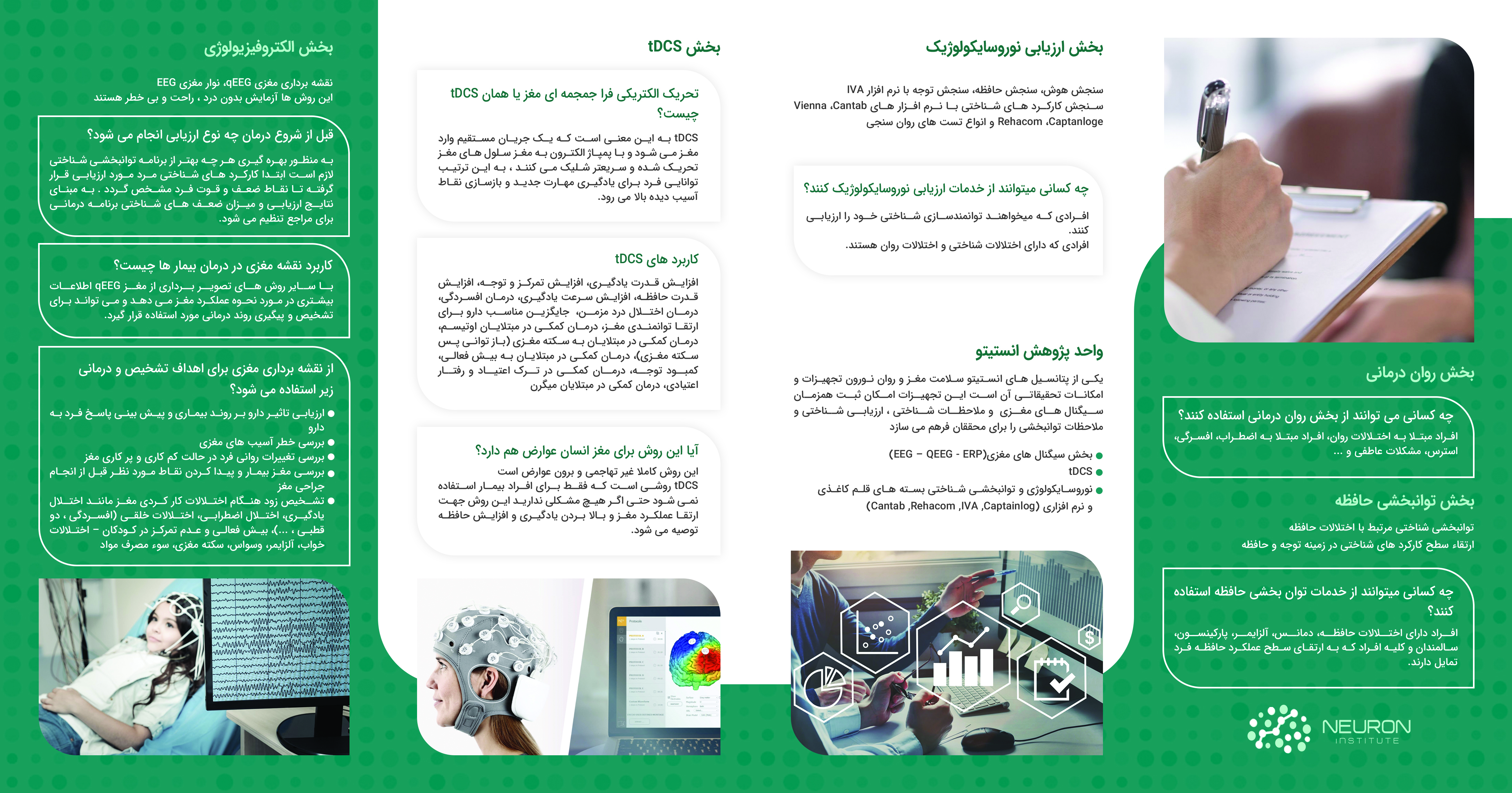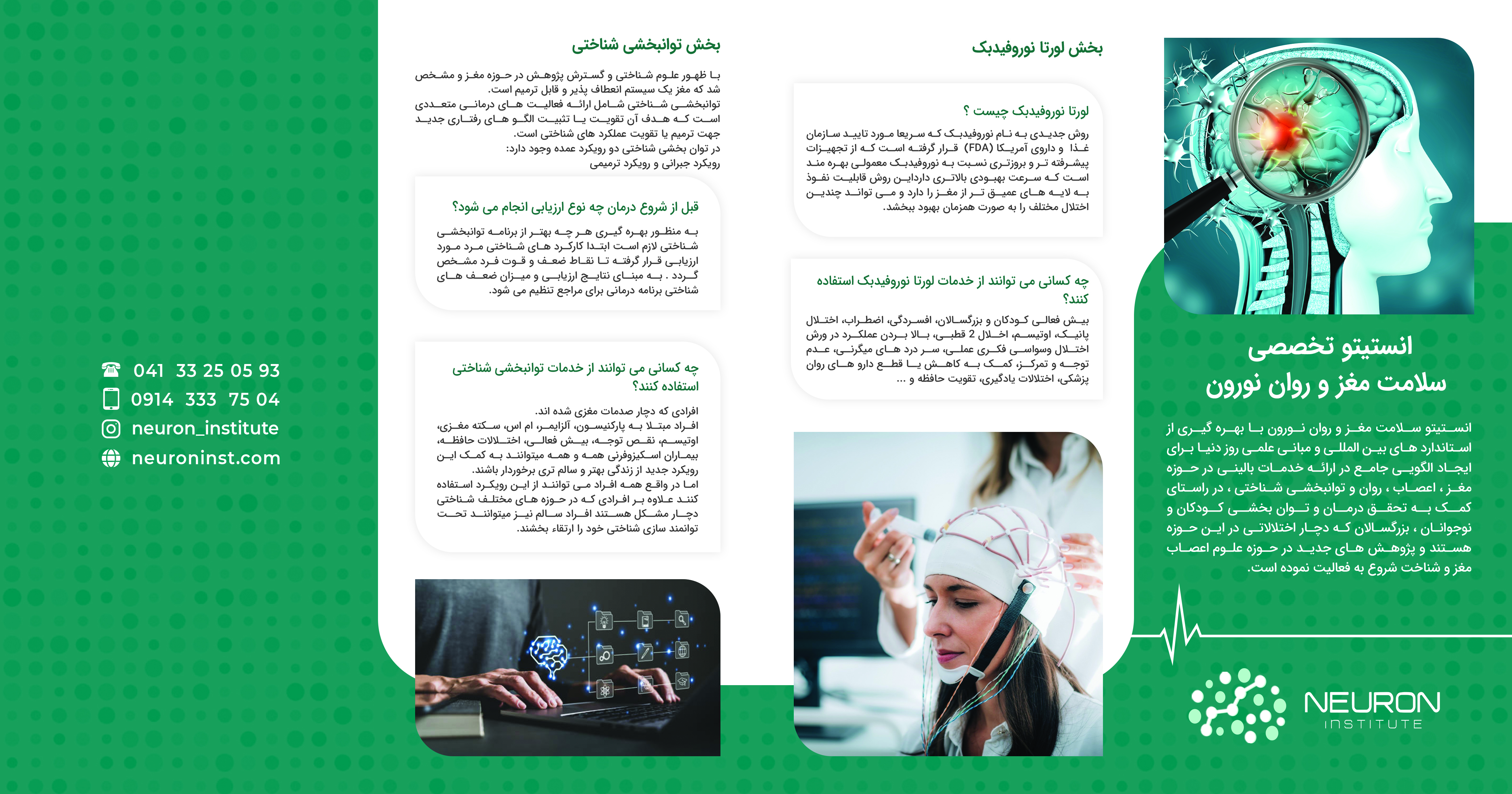 جهت آشنایی بیشتر شما عزیزان با خدمات و فعالیت های انستیتو سلامت و روان نورون، فایل های بروشور برای دانلود قرار گرفته شده اند.